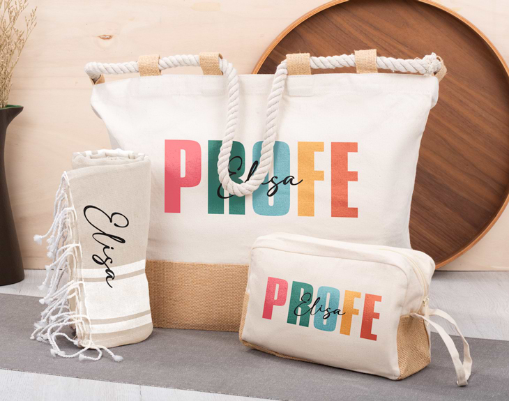 Sabemos que los profes por mucho que amen su trabajo y a sus alumnos, están deseando que llegue el verano para poder disfrutar de unas merecidas vacaciones. Por eso, este kit de bolso, neceser y toalla personalizado es el regalo perfecto con el que sorprender al mejor profe del mundo de cara a la mejor época del año: el verano. Sin duda, será el detalle perfecto para agradecerle todo lo que ha hecho este año por sus alumnos. ¡Le encantará! Es hora de que todos los padres y madres os reunáis para sorprender al profe de vuestros hijos con este original regalo. Un detalle como este será perfecto ahora que el verano está a la vuelta de la esquina porque este pack incluye un bolso, un neceser y una toalla. ¡Es ideal para esos días de playa y de piscina! Antes de entregar este regalo, tendrás que personalizar este kit de verano para profes. Añade el producto al carrito y entra en el área de personalización. En este apartado podrás personalizar tanto el bolso como el neceser con este precioso diseño de colores y también la toalla con el nombre del profesor/a de tus hijos. ¡Se quedará sin palabras con este regalo! Especificaciones del bolso: Medidas sin asas: 50 x 34 x 17,5 cm. Medidas de las asas: 50 cm. Material: 100% algodón. Gramaje: 280 g/m². Especificaciones del neceser: Medidas: 23 x 8 x 15 cm. Material: Yute / Algodón. Especificaciones de la toalla: Medidas: 180 x 90 cm. Material: 80% algodón / 20% poliéster. Gramaje: 180 g/m².