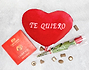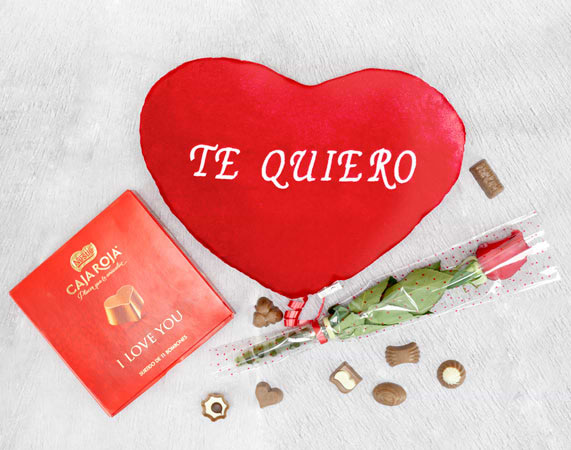 • Rosa. • Peluche corazón "Te quiero" 22 cm (voz opcional). • Bombones Nestle Caja Roja 100g. • Tarjeta Recordatoria.