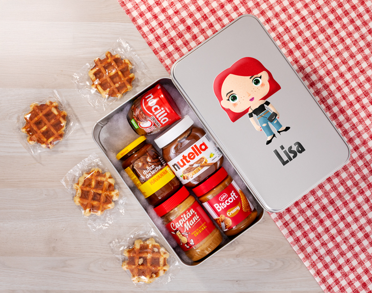 • Caja personalizada. • 4 gofres. • Bote de Nutella. • Bote de Nocilla. • Bote de Dulce de Leche. • Bote Capitán Maní. • Bote de crema Bíscoff. • Tarjeta Recordatoria.