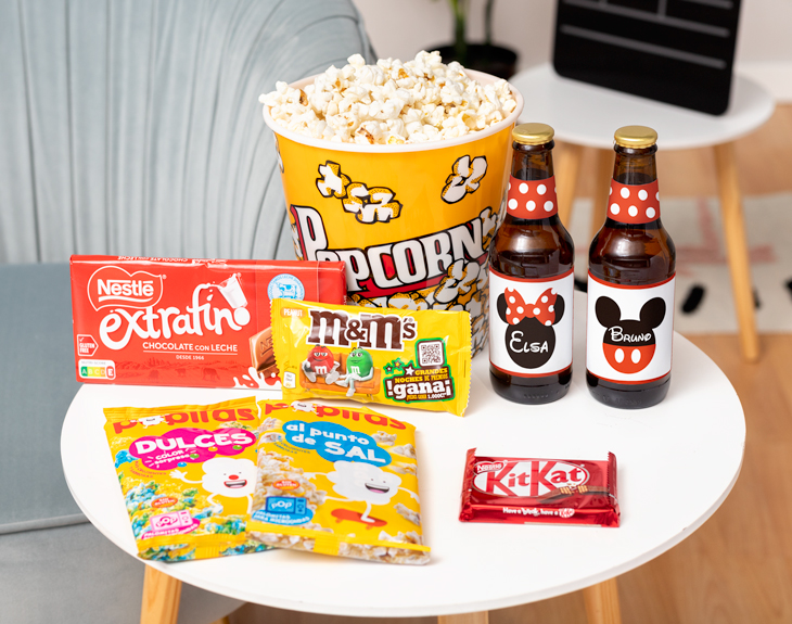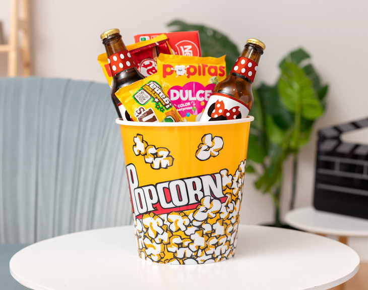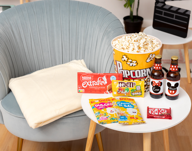• Cubo para palomitas. • Paquete de palomitas saladas. • Paquete de palomitas dulces • 2 Botellines de cervezas personalizados (250 ml). • Tableta de chocolate con leche. • 1 Kit Kat. • Bolsa de M&Ms. • Manta (Opcional). • Tarjeta recordatoria.
