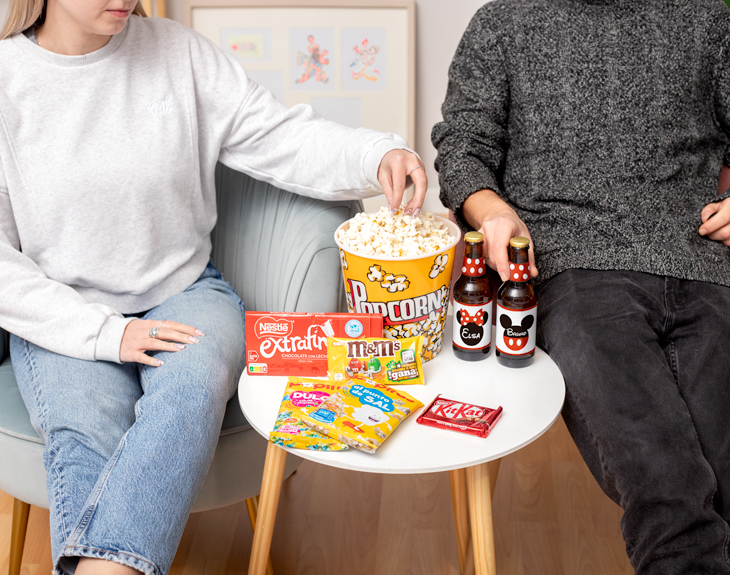 ¿Buscas sorprender a tu pareja con una cita romántica? ¿Acaso hay algo mejor que un maratón de vuestras pelis favoritas? ¡Está claro que no! Y es que tenemos el mejor aliado para esto, se trata de nuestro kit de cine personalizado con diseño de "Mickey & Minnie". ¡Es ideal! Y es que este kit de cine incluye todo lo necesario para hacer un maratón de pelis en casa. Viene con dos bolsas de palomitas (una de sal y otra de dulce), un cubo para poner las palomitas, una bolsa de m&m´s, un kitkat, una tableta de chocolate extrafino y dos botellines de cervezas personalizados. Si estás pensando en preparar un cita de cine con tu pareja, está claro que este kit es ideal. Y lo mejor es que podéis personalizar los botellines de cerveza con vuestros nombres. ¡Es genial! Personalizar este kit de cine es súper sencillo. El primer paso a seguir consiste en añadir el producto al carrito y entrar al área de personalización. Una vez ahí, ya puedes escribir vuestros nombres. Pronto quedará perfecto y listo para regalar. ¡Será un original regalo para parejas! Colores disponibles de la manta: blanco, negro o amarillo.