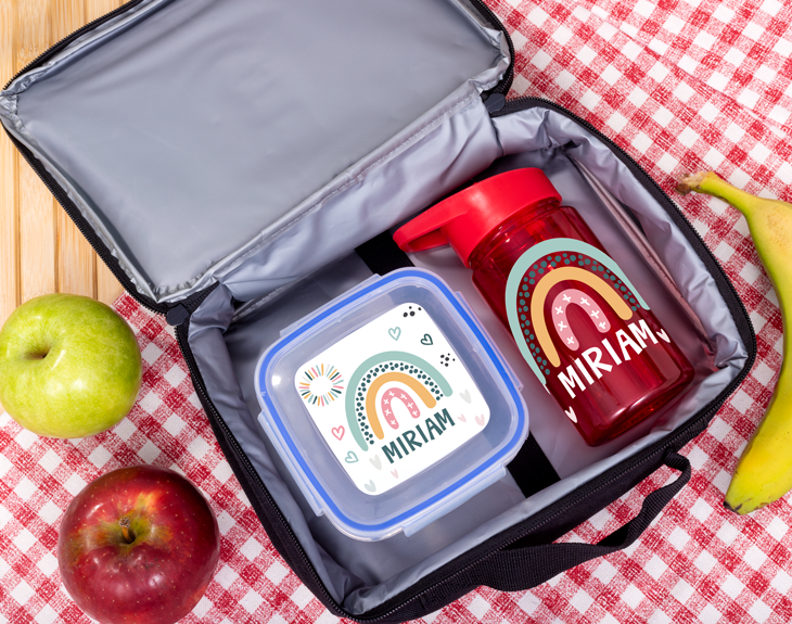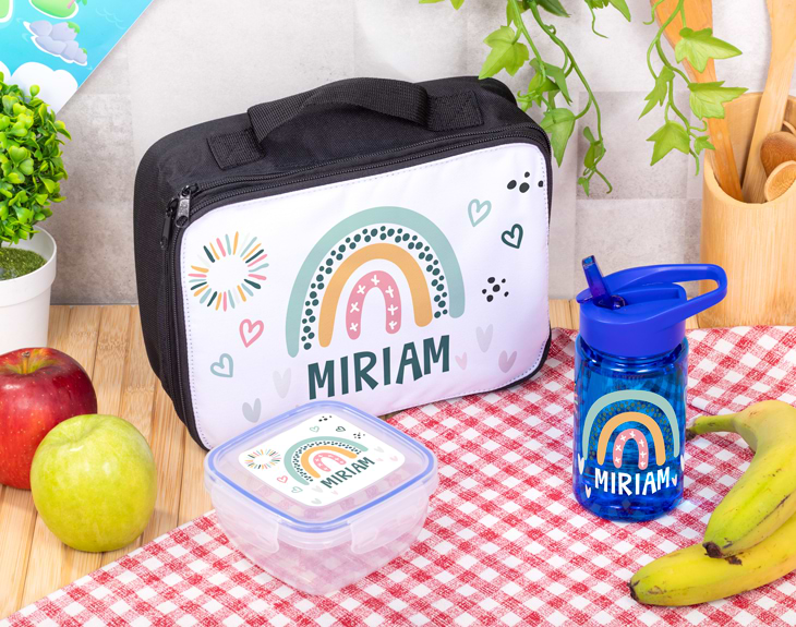 Beber agua y almorzar son dos cosas súper importantes para nuestro bienestar. Por eso, ese peque que va a comenzar su jornada escolar, tiene que ir al cole con todo lo necesario. Y nuestro kit para almuerzo personalizado con diseño "Arcoíris pastel" es perfecto para que se lo leve todos los días al colegio. Este kit incluye una botella de agua, un tupper y una lunchera. ¡Gracias a este pack no pasará nada de hambre ni sed! Y mejor de todo es que es personalizable, podrás escribir el nombre de tu hijo en todos estos productos. ¡Así todos sabrán de quien es! Personalizar este kit para almuerzo es muy sencillo. El primer paso a seguir consiste en añadir el producto al carrito y entrar al área de personalización. Una vez ahí, ya puedes escribir el nombre del peque de la casa. Pronto estará perfecto y listo para regalar. ¡Será un original regalo para la vuelta al cole! - Tupper: Medidas: 12,5 x 12,5 x 6,5 cm. Material: plástico transparente. - Botella con pajita: Altura de la botella: 16 cm. Capacidad: 400 ml. Colores: Amarillo, rojo o azul. Material: Plástico. - Bolsa para la merienda: Medidas: 24 x 8 x 7 cm.