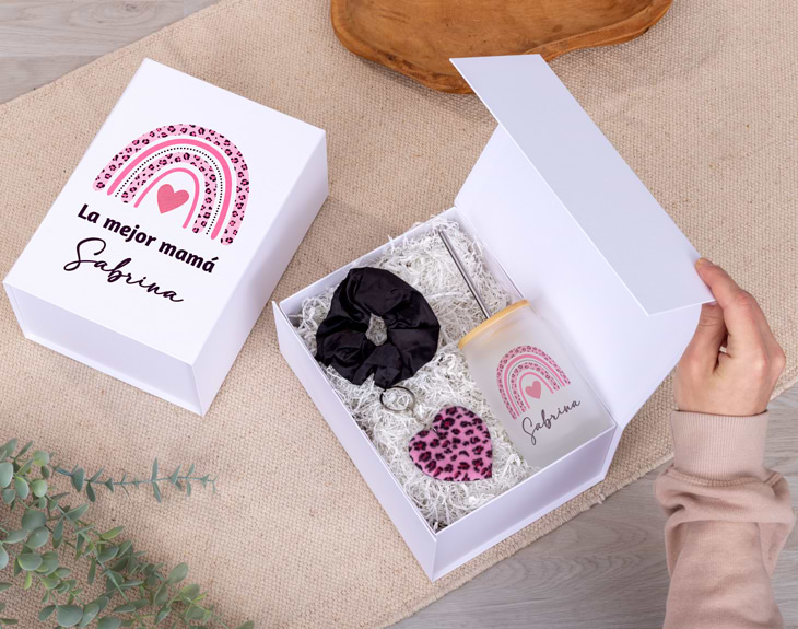Si hay alguien que se merece todo y más, esa es tu madre. Por eso, te traemos el regalo definitivo para sorprenderla en el Día de la Madre, su cumpleaños o cualquier otra ocasión especial. Se trata de un precioso kit personalizado con el diseño más rompedor de todos. Si tu madre es de las que pisa fuerte y deja huella allá donde va, este regalo original está hecho para ella. Cuenta con un diseño de animal print en tonos rosas, con el que se sentirá totalmente identificada. Y vamos a lo realmente importante, ¿qué incluye este increíble pack para las más glamourosas? - Caja personalizada con un estiloso diseño de arcoíris y detalles en animal print, perfecta para que pueda reutilizarla una y otra vez. ¡Además tiene el tamaño perfecto para guardar sus accesorios! - Vaso con tapa y pajita personalizado con su nombre y un precioso dibujo de un arcoíris, a juego con el diseño la caja. ¡Así podrá disfrutar aun más de sus bebidas favoritas! - Scrunchie de color negro, porque pocas cosas hay más prácticas que un coletero, y este, además de ser super estiloso, es evita la rotura del pelo. ¡Es fantástico! - Llavero corazón animal print rosa, el detalle perfecto para decorar sus llaves o incluso para darle un toque especial a su bolso. ¡Vivan las mamás con mucha personalidad! Medidas de la caja: 25 x 18 x 11 cm.