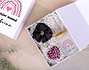 • Caja de cartón blanca personalizada (25x18x11cm). • Vaso con tapa y pajita personalizado. (400 ml) 12,5 x 7,7 cm. • Scrunchie negro. • Llavero corazón Animal Print. • Tarjeta Recordatoria.