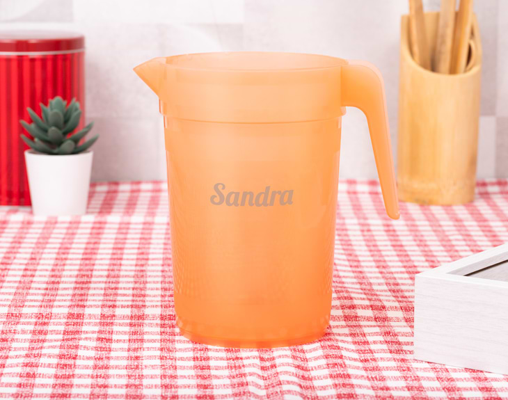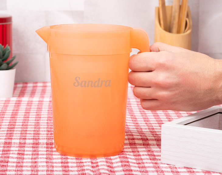 ¿Cuántas vasos de agua bebe tu hija al día? Si estás en esta página, será porque en tu casa se bebe muchísima agua. Este jarra naranja personalizado es perfecto para que lo puedan manejar los más pequeños. Este regalo irá personalizado con el nombre que tú quieras. Solo tendrás que decirnos un nombre, y grabaremos la jarra para que sea exclusivamente de él o ella. ¡Qué regalo más original! Importante: el grabado se realiza sobre plástico translúcido. Capacidad de la jarra: 1000ml