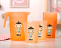 • Jarra naranja de plástico personalizada. • 10 vasos naranja de plástico personalizados. • Tarjeta Recordatoria.