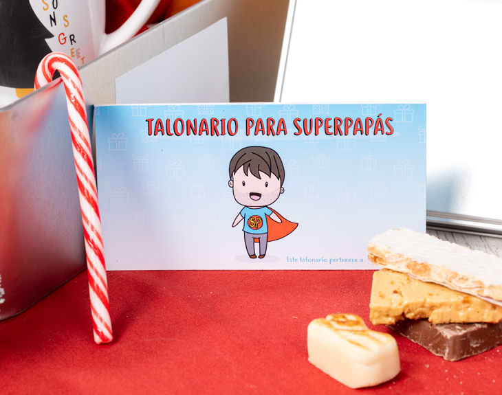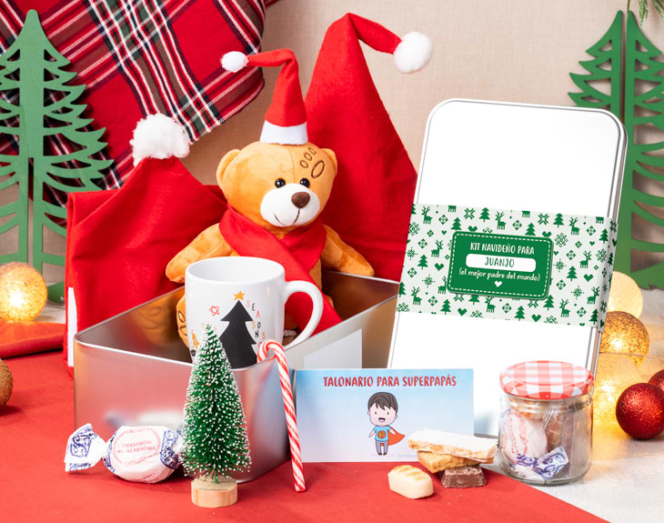 Si no sabes qué regalar a tu padre estas navidades... ¡Regálale todo! Con este kit navideño de regalos para padres, podrás hacer que se sienta como un rey. Incluye un gorro de Papá Noel, una taza navideña, un bote de turrón y muchas cosas más. Además, viene con un talonario para superpadres, con el cual tu padre podrá cumplir deseos tan guays como una tarde en familia o ver un partido de su equipo favorito (aunque tú seas del rival). Al adquirir el producto (y antes de pagar) podrás personalizar la etiqueta que cubre la caja.