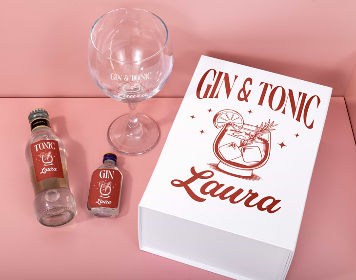 El regalo original perfecto para ese amigo que no concibe una buena noche sin su gin-tonic en mano. Este kit premium lo tiene todo para convertirse en el alma de la próxima celebración. Sorpréndele como se merece con un detalle único, pensado solo para él… ¡y con su nombre grabado! Dentro de la caja encontrará una copa de balón personalizada con el nombre o frase que elijas, ideal para brindar con estilo. Pero eso no es todo: también podrá disfrutar de una mini botella de ginebra y otra de tónica, ambas de 50 ml y personalizables. Un detalle elegante, original y cargado de personalidad. Diseñar este regalo es tan sencillo como añadirlo al carrito y acceder a nuestro editor online. Desde allí podrás personalizar cada elemento del kit a tu gusto. Si buscas un regalo personalizado para amantes del gin-tonic, este kit premium es un acierto seguro. Haz que se sienta especial y regálale un momento que no olvidará.