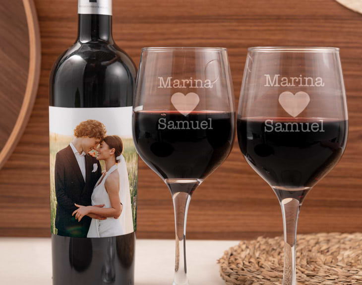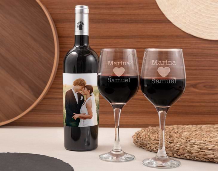 ¿Dónde encuentras un kit con 2 copas de vino grabadas con el texto que quieras y un vino personalizado con foto? Ahora puedes disfrutar de un auténtico momento romántico con tu pareja con este maravilloso kit para personas elegantes. Utilizamos como base un exquisito vino envejecido en barrica de roble de la Tierra de Castilla y León, cuya Certificación de Origen asegura que es un producto de una calidad excepcional, estamos ante un caldo sorprendente y lleno de matices, cuya botella premium y su elaborado sabor hacen de él el mejor regalo posible. Dinos el texto para las 2 copas y tendrás el kit listo para sorprender a tu pareja.