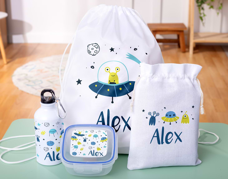 ¿La vuelta al cole se acerca a la velocidad de la luz y aún no tienes nada preparado para tu peque astronauta? ¿Y además le fascinan los planetas, las estrellas y todo lo que viene del espacio exterior? Entonces este kit personalizado para la vuelta al cole es justo lo que necesitas para despegar con buen pie hacia un nuevo curso estelar. Este pack personalizado para el cole es ideal para que el regreso al aula sea toda una aventura interestelar. Incluye: un tupper de plástico, perfecto para llevar provisiones espaciales o la merienda, claro, una mochila de cuerdas, ideal para actividades extraescolares o misiones secretas, una cantimplora para mantenerse bien hidratado durante todo el día, incluso en gravedad cero, y una mini bolsita de tela, para guardar pequeños tesoros cósmicos o accesorios interplanetarios. Este es, sin duda, un regalo original que le animará a comenzar el curso con muchísima ilusión, como si fuera su primer viaje al espacio. Viene con diseños súper divertidos de naves espaciales, planetas, marcianitos simpáticos y todo lo necesario para que tu peque se sienta como un auténtico explorador galáctico. Personalizar el kit es sencillo: solo tienes que añadirlo al carrito y, en el área de personalización, empieza la verdadera misión. Podrás diseñar cada artículo uno a uno, añadiendo el nombre de tu peque. Así irá al cole con todo lo necesario y preparado para conquistar el universo. Porque volver a clase también puede ser una misión emocionante. No olvides personalizar todos los artículos del pack para que el equipo esté listo para despegar. - Túpper: Medidas: 12,5 x 12,5 x 6,5 cm. Material: plástico transparente. - Cantimplora: Altura de la botella: 17 cm. Capacidad: 400 ml. Material: Aluminio. - Mochila de cuerdas: Medidas: 34,5 cm x 41 cm. Material: suave poliéster 210T - Bolsita de tela: Medidas: 25 x 17,5 cm.