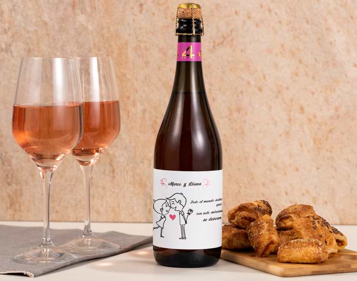 Vino joven ligeramente espumoso, dulce y de agradable sabor afrutado. El regalo original ideal para acompañar platos de pasta, quesos y postres. Si estás locamente enamorado, esta es la oportunidad perfecta para disfrutar de una comida o cena romántica con tu chica. Antes de pagar, te preguntaremos los nombres para poder personalizar el producto al máximo.