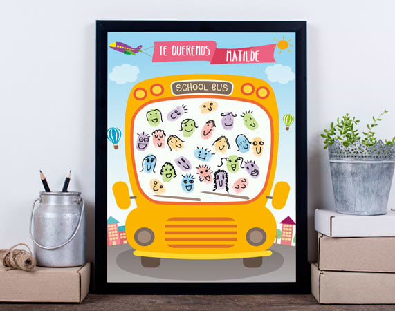 ¿Cuántos recuerdos te trae este autobús de ir a clase o de las excursiones? Esta lámina personalizada es perfecta para hacerle un regalo muy especial a vuestra profe por este año tan maravilloso. La peculiaridad del regalo es que incluye una cajita de pinturas con las que todos los alumnos podréis marcar las huellas en la ventana del autobús. ¡Hasta podréis dibujar vuestras caras! Es un regalo original para sorprenderle después de este curso tan intenso. Dinos su nombre y lo personalizaremos listo para sorprenderle. Importante: El color del marco puede variar según stock. Podrás elegir esta lámina en dos tamaños: A4 o gigante, este último con unas medidas de 85 x 60 centímetros.