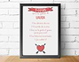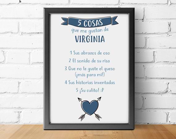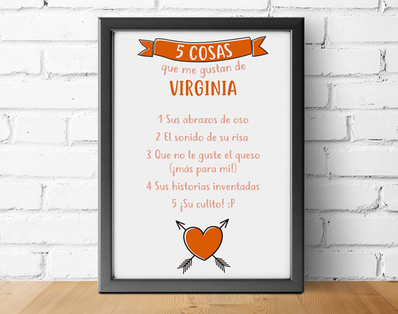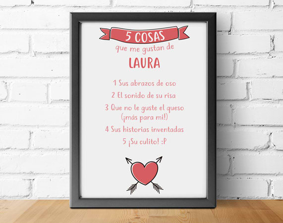 Una lámina personalizada muy tierna, sincera y divertida. Se trata de un póster con 5 cosas que adoras de tu amiga, hermana, madre, novia, o quien sea. Personaliza el regalo original con su nombre, y tendrá una lámina preciosa para decorar su casa. Puedes elegir entre 4 colores, según esté decorada la casa de la afortunada que vaya a recibir esta lámina tan original. Ponte a leer las 5 cosas y seguro que hemos acertado al 100%, ¿estas son las 5 cosas que más te gustan de ella? Importante: El color del marco puede variar según stock. Podrás elegir esta lámina en dos tamaños: A4 o gigante, este último con unas medidas de 85 x 60 centímetros.