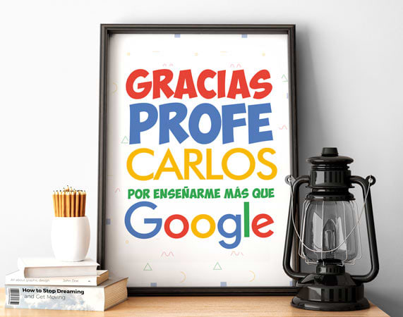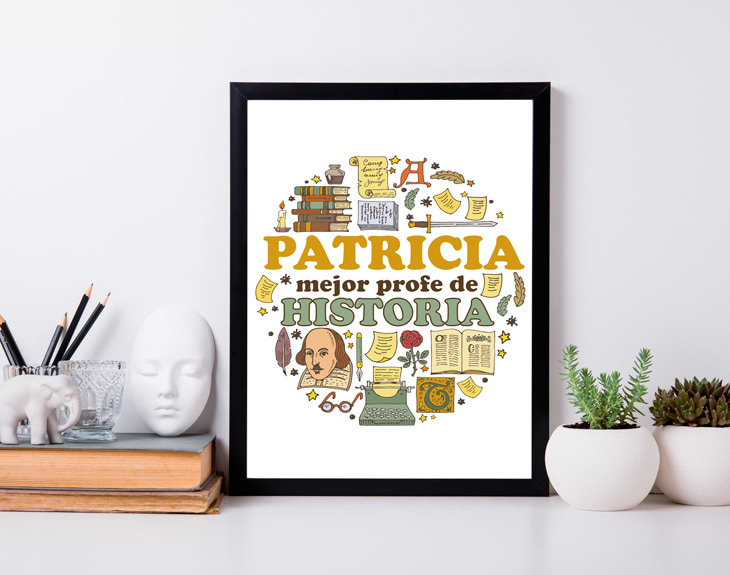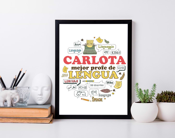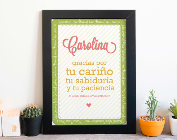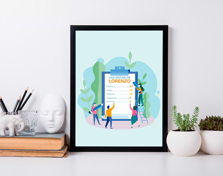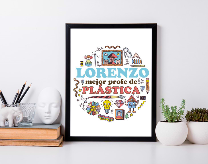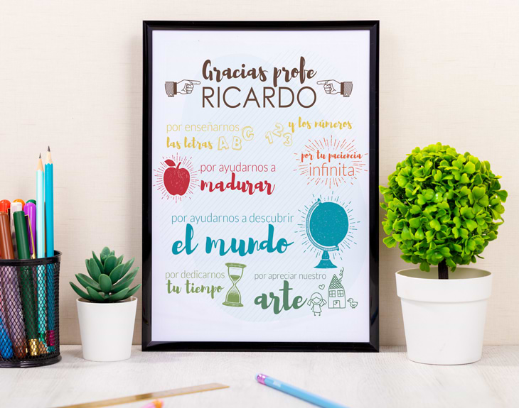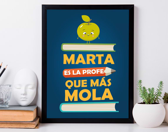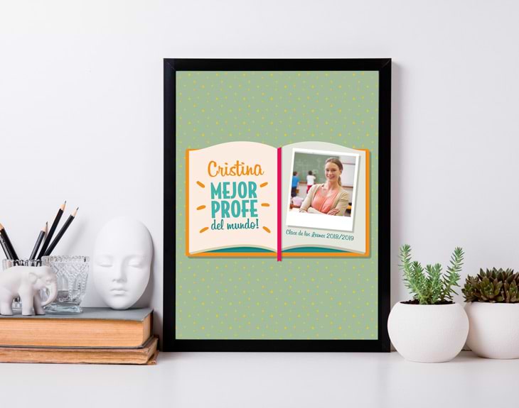 Cariño, paciencia, vocación, pasión, conocimientos... Todo esto junto hace que un profe se convierta en una figura importante para todos sus alumnos. Conseguir que les guste cualquier asignatura, que sientan ganas de aprender y que respeten los conocimientos y la forma de enseñar de su profesor o profesora, hacen que esta profesión sea única y muy satisfactoria. Por eso, si habéis tenido el mejor profe durante este curso, se merece un regalo tan bonito como esta lámina personalizada. Su diseño conquistará el corazoncito de cualquier profe y servirá para que nunca olvide a su clase y se acuerde de lo bonito que es ser profesor. ¡Le encantará! Cuando llega fin de curso, a los padres les gusta agradecer al profe de sus hijos todo lo que han hecho por ellos. Una buena forma de hacerlo es con esta original lámina. Es un detalle único y diferente para cualquier profe y es perfecto para que pueda ponerlo en su mesa de trabajo o en cualquier rinconcito de casa. Siempre se acordará de todos sus alumnos, los buenos momentos que pasaron y cuánto les ha enseñado. Si tenéis el mejor profe, hacedle el mejor regalo. Si queréis hacer el mejor regalo en fin de curso, tenéis que personalizar esta lámina. Primero, hay que elegir el tamaño que más os guste y después añadir el producto al carrito. Nosotros te dejamos el diseño para que tú solo tengas que escribir el nombre de tu profe y poner lo que quieras en los demás espacios vacíos. Una vez hecho esto, la lámina ya estará lista para entregar. Contamos con dos tamaños de lámina distintos: lámina junto con el marco a tamaño A4 y una lámina de tamaño póster, de 85 x 60 cm. ¡Escoge el que más te guste! Importante: El color del marco puede variar según stock.