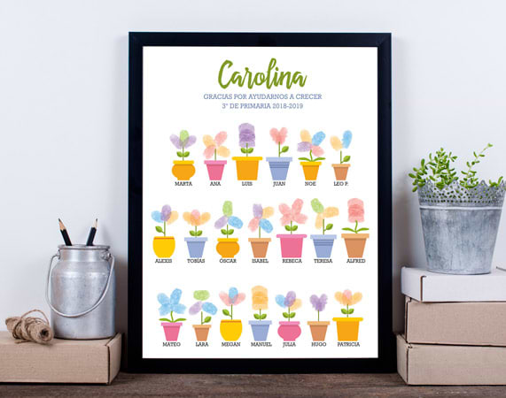 Nuestra lámina personalizada para profes es perfecta para darle una sorpresa enorme a vuestra mejor profesora o profesor. Si estáis toda la clase de acuerdo, y pensáis que esa profe se merece un detalle por ayudaros a crecer. Se trata de un regalo súper original, en el que irá impreso el nombre de la profe o el profe, y todos los nombres de los alumnos. ¡Pero no solo eso! Sino que el regalo incluye una cajita de pinturas para poder marcar las huellas de cada alumno. Sorprended a los profesores con este detallazo. Importante: El color del marco puede variar según stock. Podrás elegir esta lámina en dos tamaños: A4 o gigante, este último con unas medidas de 85 x 60 centímetros.