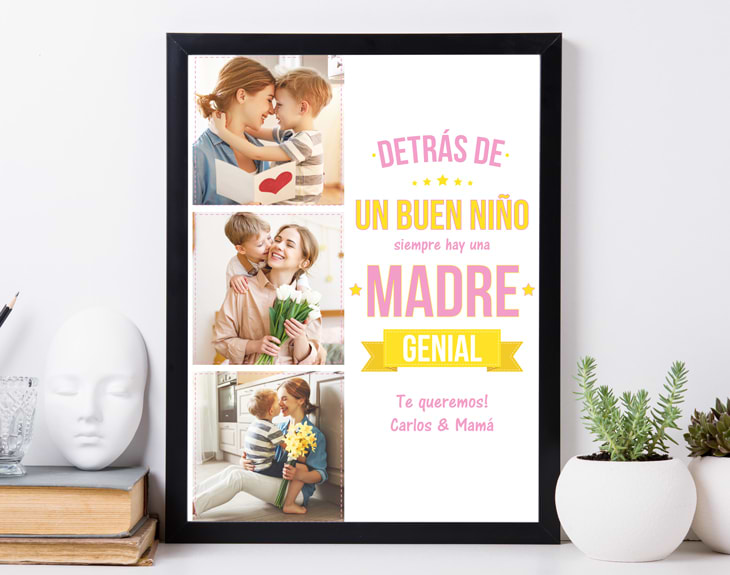 Tu madre se merece de todo por ser la mejor del mundo y por ser la persona más genial que existe. Por eso, estamos de acuerdo que no hay un regalo mejor que esta lámina personalizada. Es perfecta para tener enmarcados vuestros mejores recuerdos y que siempre que quiera pueda ver ese bonito regalo que sus hijos le han hecho. Con esta preciosa lámina, podrá recordar lo bonito que es ser madre. Elige esta original forma de enmarcar vuestros recuerdos y deja a mamá sin palabras. Seguro que quieres sorprender a mamá en una fecha tan especial como el Día de la Madre o su cumpleaños. Con esta original lámina acertarás seguro en cualquier ocasión donde mamá es la protagonista. Este diploma será un regalo único y muy especial para mamá. Podrá colocarlo donde quiera y decorar cualquier rincón de la casa. Además, l mejor es que podrás elegir el tamaño que más te guste: una lámina A4 con su marco incluido o imprimir este diseño a lo grande en un póster de 60 x 85 centímetros. Toca personalizar tu propia lámina para sorprender a mamá. Elige el tamaño, añade el producto al carrito y comienza a crear tu propio diseño. En la plantilla que te dejamos podrás añadir tus tres fotos favoritas con mamá y escribir una breve dedicatoria en la parte inferior. Una vez hecho esto, el regalo ya estará listo para entregar. Importante: El color del marco puede variar según stock.
