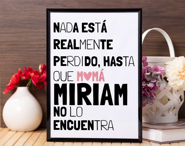 Una de las frases más míticas de una madre es ¿A que voy yo y lo encuentro?". Y es que todas las madres tienen ese don de poder encontrar todo lo que se pierde en casa. Si gracias a tu madre siempre encuentras todo lo que necesitas, está claro que tienes que regalarle esta lámina personalizada con diseño "Nada está realmente perdido, hasta que mamá no lo encuentra". Esta lámina es el regalo perfecto para sorprender a tu mamá. Es genial para el Día de la Madre, para su cumpleaños o para cualquier ocasión especial. ¡Le encantará! Lo mejor es que es personalizable. ¡Podrás escribir el nombre de la mejor mamá del mundo! Personalizar esta lámina es muy sencillo. El primer paso a seguir consiste en añadir el producto al carrito y entrar al área de personalización. Una vez ahí, ya puede escribir el nombre de la mejor mamá del mundo. Pronto estará perfecto y listo para regalar. ¡Será un original regalo para madres! Importante: El color del marco puede variar según stock. Importante: Las opciones de lámina gigante y grande no incluyen marco. Solo tiene marco la opción de A4. Podrás elegir esta lámina en el tamaño que quieras: A4, grande (48 x 33 cm) o gigante (85 x 60 cm). Importante: Si escoges la opción "versión digital" te enviaremos el diseño por mail en alta resolución. De esta manera, tendrá la calidad necesaria para que puedas imprimirla en cualquier formato. En el formulario de entrega tendrás que seleccionar la opción "Recibir por Email para ahorrar los gastos de envío".