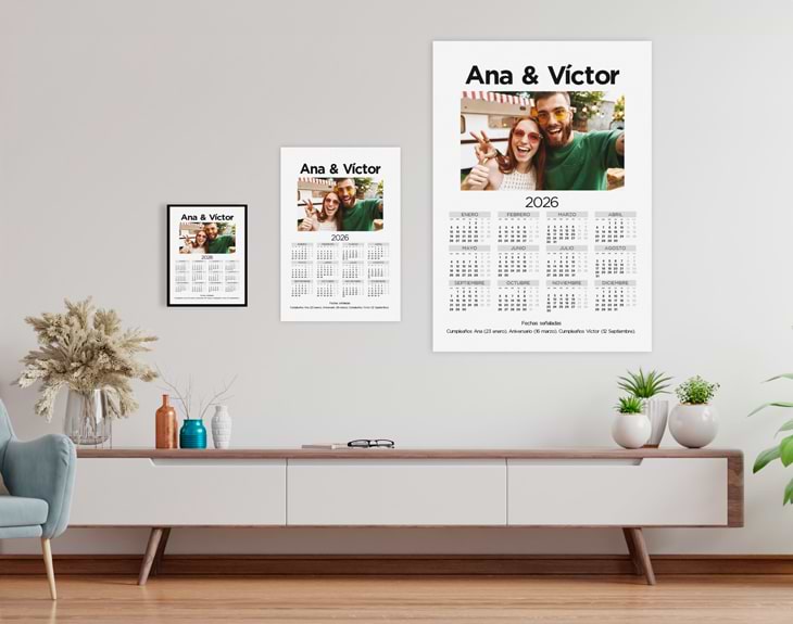 Ya se acerca una de las fechas más bonitas del año... ¡El día de los enamorados! Todo se llena de corazones y de mucho amor. ¡San Valentín está a la vuelta de la esquina! Si este año quieres sorprender a tu pareja en esta ocasión tan especial, nuestra lámina personalizada "Calendario con foto" será una opción súper romántica. Y es que lo que hace verdaderamente especial a esta lámina es que es personalizable. Podrás poner la foto que tú quieras en este calendario tan chulo, una foto de tu amorcito, de un viaje que hayas hecho o una foto que te traiga buenos recuerdos. ¡Será un regalo muy original! Personalizar esta lámina es súper sencillo. El primer paso a seguir consiste en añadir el producto al carrito y entrar al área de personalización. Una vez ahí, ya puedes poner la foto que tú quieras y escribir las fechas señaladas más importantes. Pronto estará perfecto y listo para regala. ¡Será original regalo para enamorados! Importante: Si escoges la opción "versión digital" te enviaremos el diseño por mail en alta resolución. De esta manera, tendrá la calidad necesaria para que puedas imprimirla en cualquier formato. En el formulario de entrega tendrás que seleccionar la opción "Recibir por Email para ahorrar los gastos de envío". Importante: El color del marco puede variar según stock.