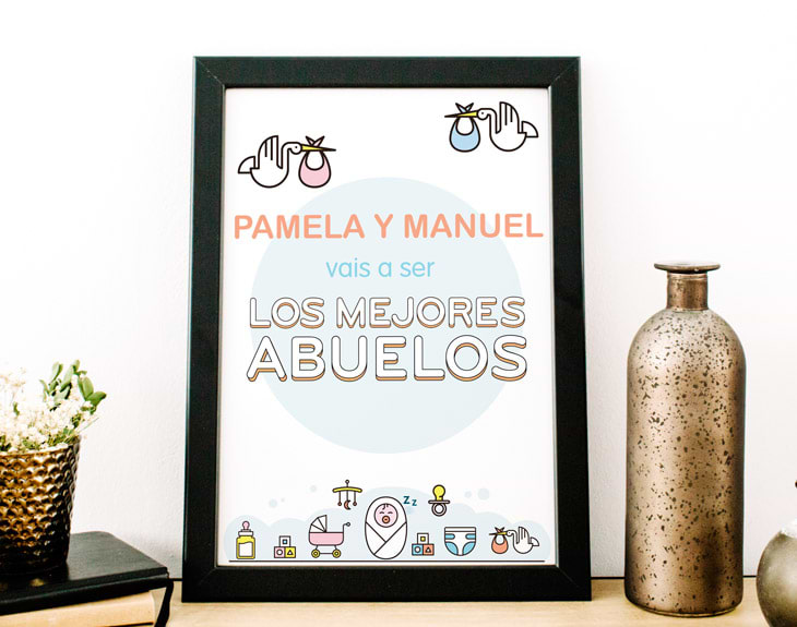 Tus padres van a querer enmarcar cada foto que tengan de tu hijo/a. Hasta que ese momento llegue, sorpréndeles con el primer regalo de su nieto/a: esta preciosa lámina personalizada con sus nombres y un monísimo diseño infantil. ¡Qué mejor manera de decirles que los vas a hacer abuelos! Ellos seguro que te ayudarán en todo lo que necesites con tu hijo/a con todo el placer del mundo. Por ello, esta lámina personalizada no solo es el mejor regalo original para darles la gran noticia, sino que además será la manera más bonita de agradecerles todo su apoyo. ¡Dedícaselo exclusivamente con sus nombres! Crea expectación por el nuevo miembro de la familia y haz que los futuros abuelos le esperen con aún más ganas. Puedes elegir entre dos tamaños de lámina: A4 con marco o gigante de 60x85 cm. Importante: El color del marco puede variar según stock.