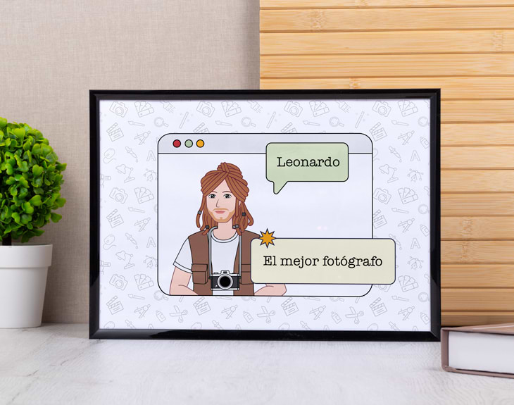Fotógrafo, bombero, maestro, policía... Sea la profesión que sea, si quieres sorprender a esa persona que adora su trabajo, tenemos el detalle perfecto. Nuestra lámina personalizada con diseño "Profesiones ventana" es un regalo único para cualquier ocasión especial. Esta lámina es genial decorar cualquier rincón de la casa, le dará un toque más personal y original. Además, lo más guay de esta lámina es que es personalizable, podrás crear a este avatar con características de profesiones. Hay un montón de rasgos y accesorios para que te puedas representar a la perfección. ¡Quedará genial! Personalizar esta lámina es muy sencillo. El primer paso a seguir consiste en añadir el producto al carrito y entrar al área de personalización. Una vez ahí, ya puedes crear al avatar de la profesión que tú quieras. Pronto estará perfecta y lista para regalar. ¡Será un original regalo! Importante: Si escoges la opción "versión digital" te enviaremos el diseño por mail en alta resolución. De esta manera, tendrá la calidad necesaria para que puedas imprimirla en cualquier formato. En el formulario de entrega tendrás que seleccionar la opción "Recibir por Email para ahorrar los gastos de envío". Importante: El color del marco puede variar según stock.