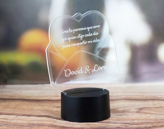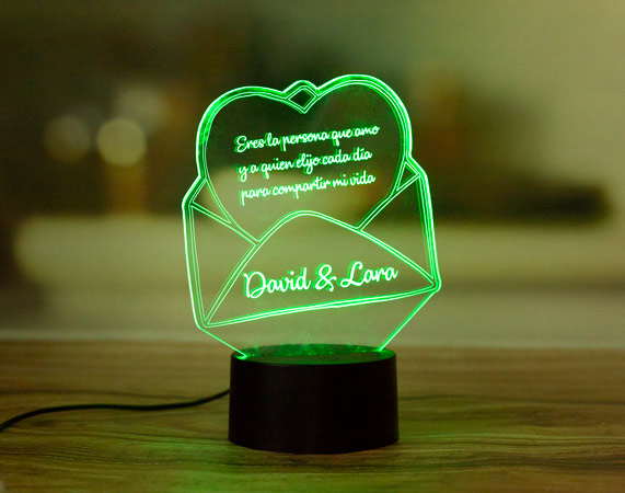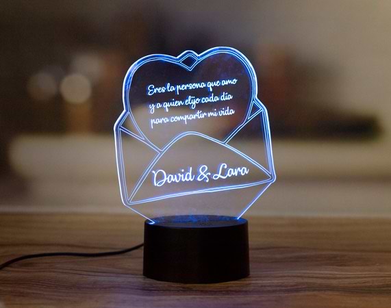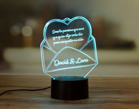 Tanto si eres de los que piensan que las cartas de amor es algo anticuado, como si crees que es una romántica demostración amor, esta carta de amor te conquistará. Es una forma increíble de decirle todo lo que sientes a esa persona que te ha robado el corazón. Se trata de una lámpara de metacrilato personalizada perfecta para sorprender a tu pareja. Solamente tienes que decirnos vuestros nombres y el mensaje que quieras decirle. ¡Le encantará! Funcionamiento: La lámpara funciona con un cable USB (incluido). La base negra cuenta con diferentes colores, que se pueden adaptar a tus gustos: si pulsas una vez te saldrá un color, si pulsas de nuevo, aparecerá otro, y así sucesivamente. También podrás elegir la opción intermitente: ¡todas las luces creando un festín de colores! Mientras tanto, la base de madera solo cuenta con una luz, que se apagará y se encenderá cada vez que aprietes el interruptor. Puedes escoger entre las siguientes bases: -Base negra: sus medidas son de 8,3cm (diámetro) x 4,8cm (alto), y está hecha de plástico. Cuenta con luces de colores. -Base de madera: sus medidas son de 14,5x6x3,5cm, y está hecha de madera. Cuenta con una sola luz, de color blanco. Medidas aproximadas: 13 cm x 17 cm (metacrilato). Importante: puede que el metacrilato llegue con un plástico protector.