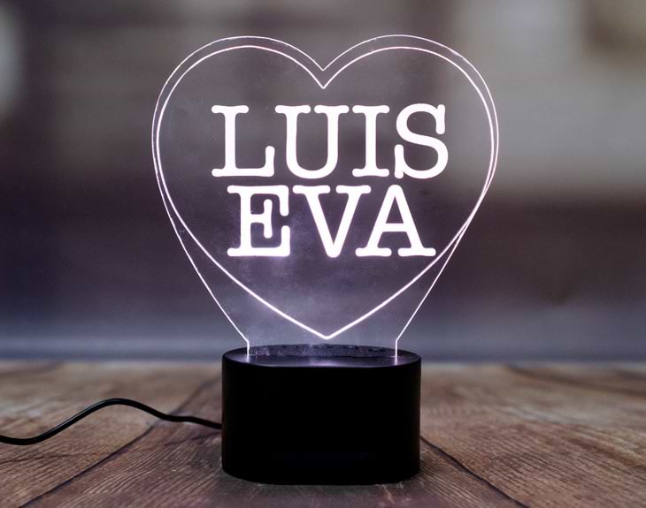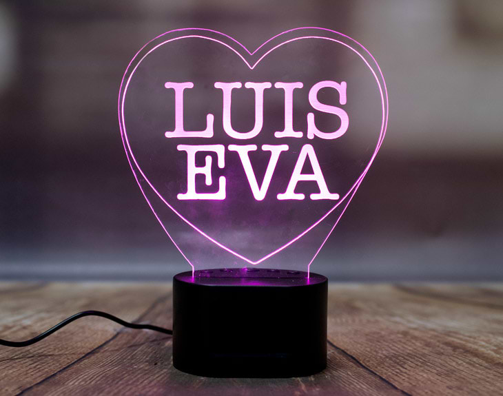 ¡La lámpara de los enamorados! Una bonita lámpara de metacrilato personalizada con un corazón que tiene vuestros nombres en el interior. ¿Quieres más? ¡Lo único que le falta es hacer que vuestros días no sean tan duras, pero lamentablemente eso es imposible. Importante: el soporte te dará la posibilidad de elegir el color de las luces. Si pulsas una vez te saldrá un color, si pulsas de nuevo, aparecerá otro, y así sucesivamente. También podrás elegir la opción intermitente: ¡todas las luces creando un festín de colores! Medidas aproximadas de la base: 8,3cm (diámetro) x 4,8cm (alto). Importante: puede que el metacrilato llegue con un plástico protector.