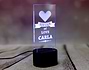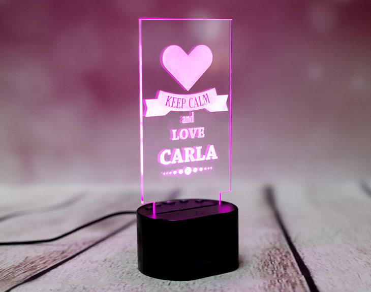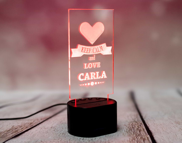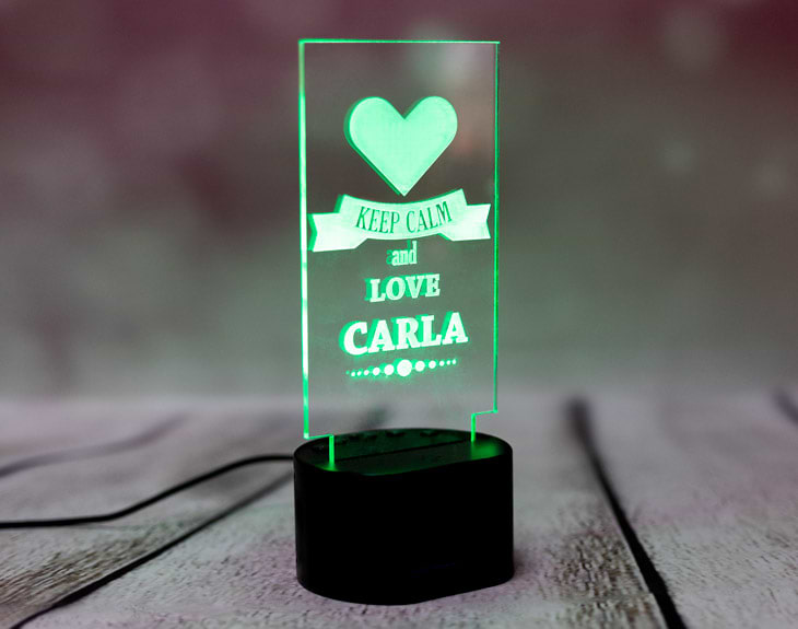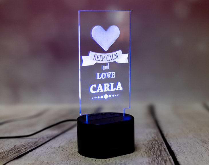 La lámpara de metacrilato personalizada más original del mundo. Si te apetece darle una sorpresa a tu pareja, este regalo puede ser lo que estás buscando: se trata de una lámpara personalizado con uno de los mensajes más famosos de la historia y añadiéndole el nombre que quieras. Keep calm and love tu pareja será, a partir de ahora, el tierno mensaje que veas todos los días. Dale una sorpresa enorme y vivid juntos todos los días llenos de amor. Funcionamiento: La lámpara funciona con un cable USB (incluido). La base negra cuenta con diferentes colores, que se pueden adaptar a tus gustos: si pulsas una vez te saldrá un color, si pulsas de nuevo, aparecerá otro, y así sucesivamente. También podrás elegir la opción intermitente: ¡todas las luces creando un festín de colores! Mientras tanto, la base de madera solo cuenta con una luz, que se apagará y se encenderá cada vez que aprietes el interruptor. Puedes escoger entre las siguientes bases: -Base negra: sus medidas son de 8,3cm (diámetro) x 4,8cm (alto), y está hecha de plástico. Cuenta con luces de colores. -Base de madera: sus medidas son de 14,5x6x3,5cm, y está hecha de madera. Cuenta con una sola luz, de color blanco. Medidas aproximadas: 13 cm x 17 cm (metacrilato). Importante: puede que el metacrilato llegue con un plástico protector.