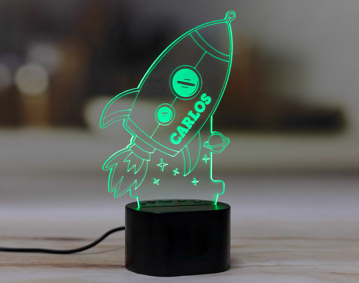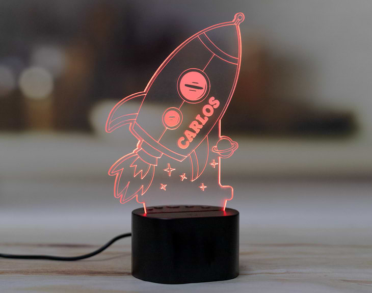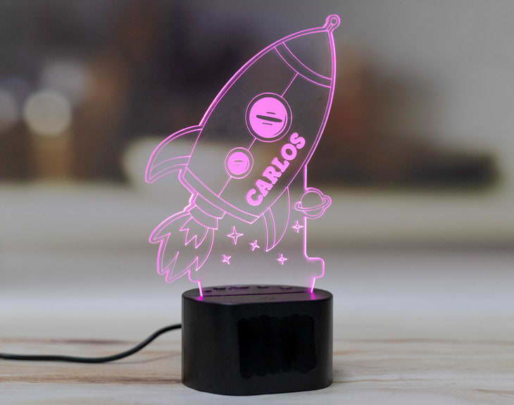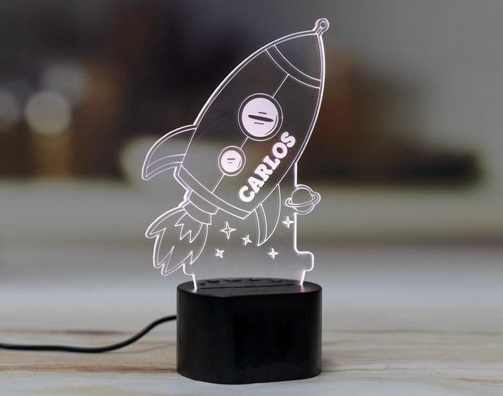 Ilumina tu habitación con este estupendo cohete personalizado. Es un regalo perfecto para dárselo a esa persona que siempre ha deseado conocer los orígenes del firmamento. El regalo perfecto para decorar una habitación infantil... o no tan infantil. Un viaje a las estrellas que seguro le encantará. Funcionamiento: La lámpara funciona con un cable USB (incluido). La base negra cuenta con diferentes colores, que se pueden adaptar a tus gustos: si pulsas una vez te saldrá un color, si pulsas de nuevo, aparecerá otro, y así sucesivamente. También podrás elegir la opción intermitente: ¡todas las luces creando un festín de colores! Mientras tanto, la base de madera solo cuenta con una luz, que se apagará y se encenderá cada vez que aprietes el interruptor. Puedes escoger entre las siguientes bases: -Base negra: sus medidas son de 8,3cm (diámetro) x 4,8cm (alto), y está hecha de plástico. Cuenta con luces de colores. -Base de madera: sus medidas son de 14,5x6x3,5cm, y está hecha de madera. Cuenta con una sola luz, de color blanco. Medidas aproximadas: 13 cm x 17 cm (metacrilato). Importante: puede que el metacrilato llegue con un plástico protector.