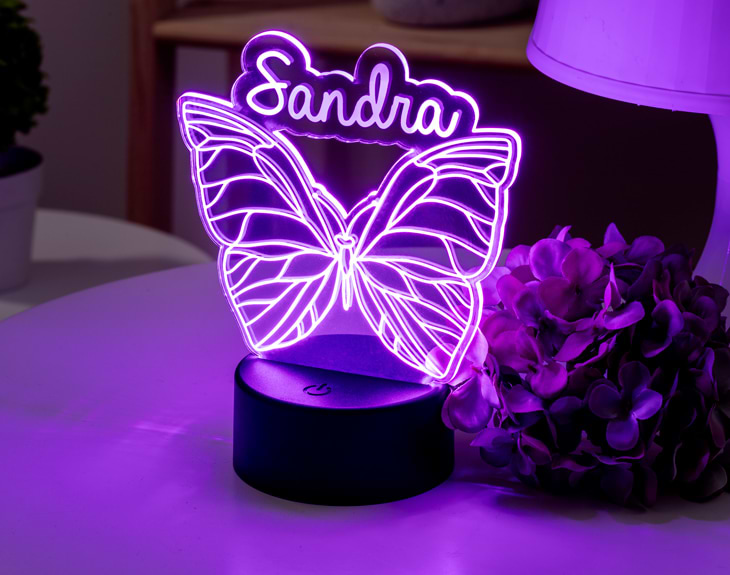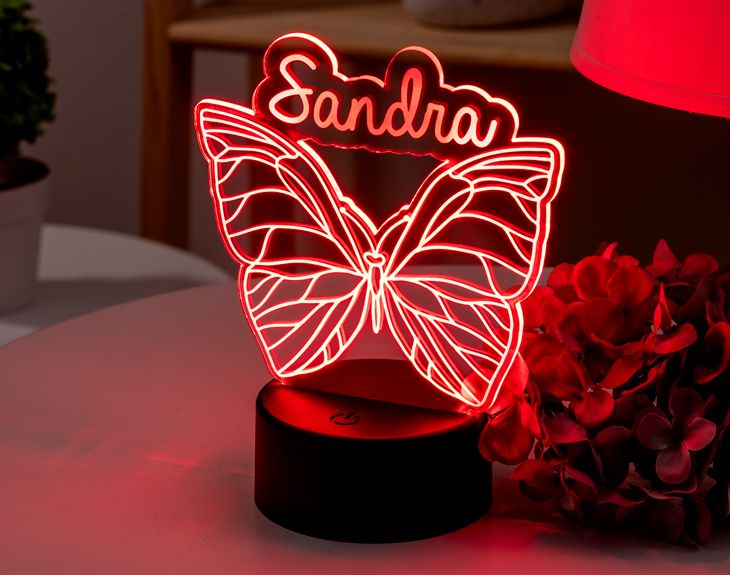 Si una de las imágenes más bonitas para ti es la de las mariposas volando por el campo, esta lámpara de metacrilato personalizada está diseñada para ti. Solo tendrás que decirnos un nombre para que podamos personalizarla, y dejarla lista para que ambientes la habitación más relajante que tengas en casa. Funcionamiento: La lámpara funciona con un cable USB (incluido). La base negra cuenta con diferentes colores, que se pueden adaptar a tus gustos: si pulsas una vez te saldrá un color, si pulsas de nuevo, aparecerá otro, y así sucesivamente. También podrás elegir la opción intermitente: ¡todas las luces creando un festín de colores! Mientras tanto, la base de madera solo cuenta con una luz, que se apagará y se encenderá cada vez que aprietes el interruptor. Puedes escoger entre las siguientes bases: -Base negra: sus medidas son de 8,3cm (diámetro) x 4,8cm (alto), y está hecha de plástico. Cuenta con luces de colores. -Base de madera: sus medidas son de 14,5x6x3,5cm, y está hecha de madera. Cuenta con una sola luz, de color blanco. Medidas aproximadas: 13 cm x 17 cm (metacrilato) Importante: puede que el metacrilato llegue con un plástico protector.