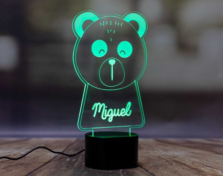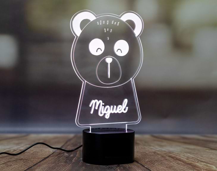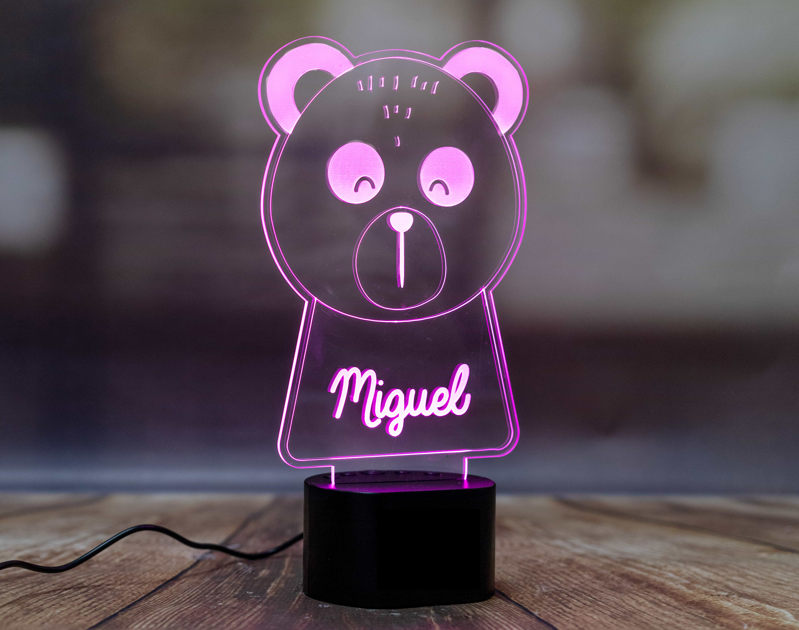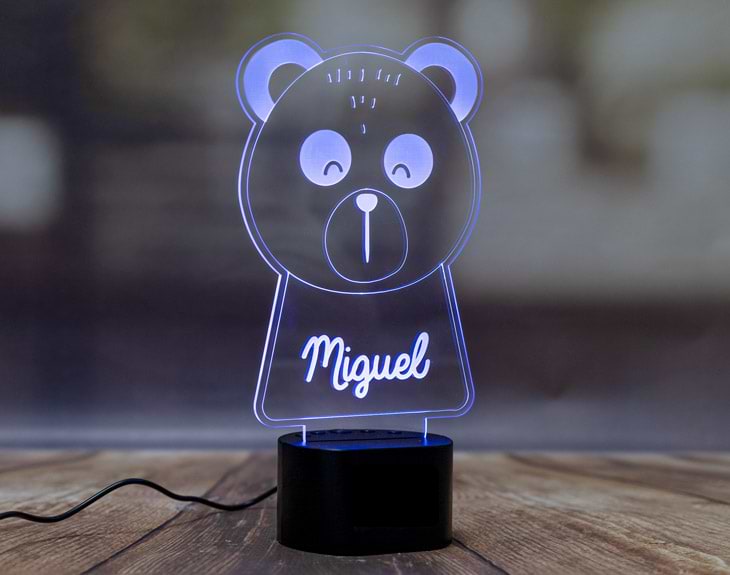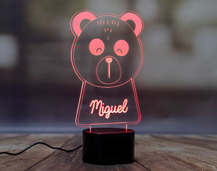 Los osos panda están de moda y nunca dejarán de estarlo. Por eso, esta lámpara de metacrilato personalizada siempre será un buen regalo: con la silueta de un panda, personalizada con tu nombre. Un bonito regalo para prácticamente cualquier persona. Funcionamiento: La lámpara funciona con un cable USB (incluido). La base negra cuenta con diferentes colores, que se pueden adaptar a tus gustos: si pulsas una vez te saldrá un color, si pulsas de nuevo, aparecerá otro, y así sucesivamente. También podrás elegir la opción intermitente: ¡todas las luces creando un festín de colores! Mientras tanto, la base de madera solo cuenta con una luz, que se apagará y se encenderá cada vez que aprietes el interruptor. Puedes escoger entre las siguientes bases: -Base negra: sus medidas son de 8,3cm (diámetro) x 4,8cm (alto), y está hecha de plástico. Cuenta con luces de colores. -Base de madera: sus medidas son de 14,5x6x3,5cm, y está hecha de madera. Cuenta con una sola luz, de color blanco. Medidas aproximadas: 13 cm x 17 cm (metacrilato). Importante: puede que el metacrilato llegue con un plástico protector.