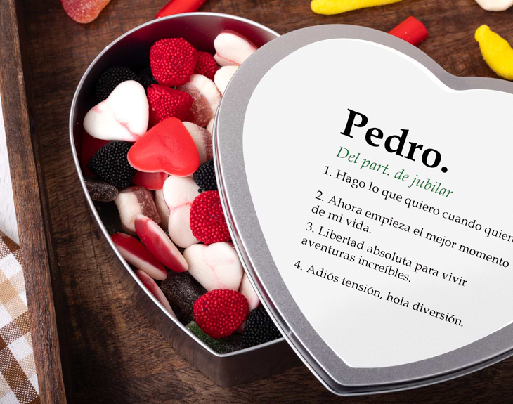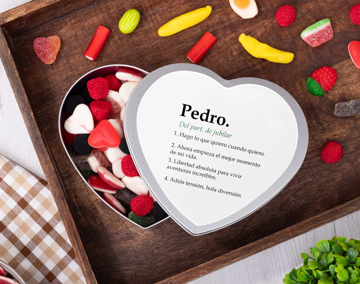 ¿Conoces a alguien que se va a jubilar en breves y quieres que empiece esta nueva época de la manera más dulce?¡Entonces esta lata de chuches personalizada tiene su nombre! ¿Te imaginas lo guay que será cuando abra la lata y descubra que está llena de chucherías?¡Le encantará! Lo más guay todo, es que personalizaremos la tapa con el diseño más divertido de todos. Se trata de la mejor definición de jubilación que hayas visto nunca: hacer lo que quieras cuando quieras, dedicar todo el tiempo a tus padiones, olvidarte de las tensiones y responsabilidades y exprimir 100% la vida. ¡Qué comience la aventura! Solamente tienes que decirnos su nombre para insertarlo en la pegatina y podrás sacarle una gran sonrisa. ¡Seguro que decide compartir contigo sus chuches! Importante: Las chucherías pueden variar según stock. Importante: El color de la lata puede variar en función del stock, pero no tendrás de qué preocuparte. ¡Quedará genial! Importante: si puedes tener reacción a cualquier tipo de alérgenos, puedes escribirnos para consultar si hay alguna opción alternativa.