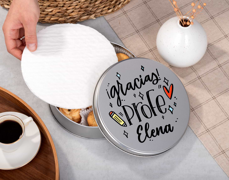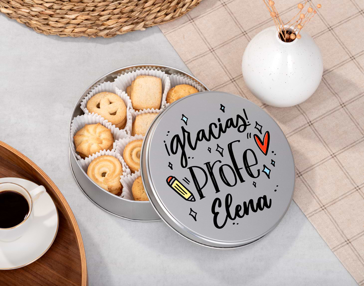 Esta lata de galletas personalizada es el regalo más dulce que le podéis hacer a vuestro profe para darle las gracias por todo lo que ha hecho este año. Sin duda, será la mejor forma de agradecerle todo el esfuerzo y dedicación que ha tenido con su clase. ¡Se le hará la boca agua! Fin de curso es el momento perfecto para que ese profesor o profesora se vaya a casa con un detalle tan guay como esta original lata llena de galletas y con un mensaje muy especial: ¡gracias profe! Además, con este detalle ningún profe se podrá olvidar de esos alumnos con los que ha compartido un año lleno de momentos increíbles. Para personalizar esta lata de galletas, el primer paso es acceder a nuestro diseñador. Una vez dentro, podrás escribir el nombre del profe, colocarlo y listo. Nosotros nos encargamos de que quede todo perfecto y listo para disfrutarlo. ¡Será el mejor regalo del mundo! Diámetro: 19 cm. Peso: 277g aprox.