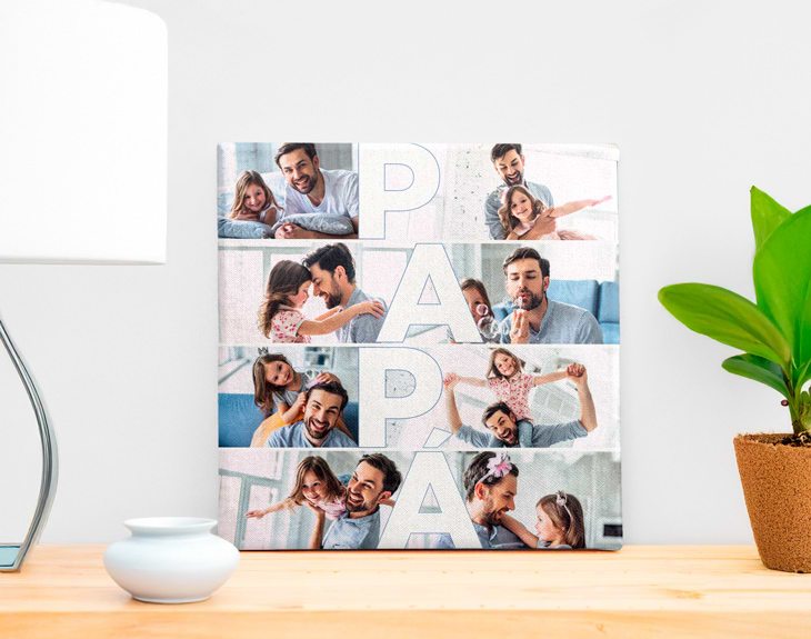 Si buscas una forma única de demostrarle a papá lo importante que es para ti y todo el amor que sientes por él, tenemos el regalo perfecto. Nuestro lienzo personalizado con el diseño "Momentos de papá" es ideal para recopilar todos esos momentos de felicidad que habéis compartido. Ya sea para su cumpleaños, el Día del Padre o cualquier ocasión especial, este detalle lo emocionará profundamente. Con este lienzo cuadrado personalizado para papá, podrá contemplar a diario esos recuerdos tan especiales. El producto llega listo para ser colgado en la pared, con el bastidor cubierto por el lienzo, en el que se plasmará este diseño tan único. Contamos con 6 tamaños distintos, desde los 30 hasta los 90 centímetros de longitud en cada lado. Personalizar este regalo original para padres es muy sencillo. Al escoger el tamaño que quieras en el desplegable, podéis añadirlo al carrito. En el interior del diseñador podréis personalizar el lienzo, añadiendo las fotos que quieras a la plantilla clicando encima del cuadro de foto. Solo tendréis que subirla al sistema y ajustarla al cuadrado de la plantilla. ¡Será un detalle increíble para papá! • Los laterales quedan envueltos con el propio lienzo. • Bastidor de 3cm de madera samba. • Impresión a 1440dpi. • Tintas con protección para rayos UV. • Lienzo de algodón de alta calidad ultra blanco de 415 gramos. • Se entrega montado, listo para colgar.