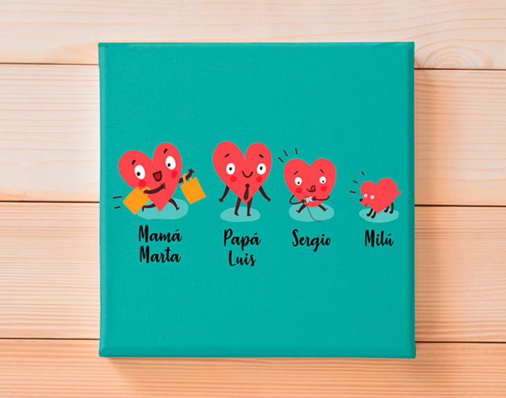 El lienzo personalizado perfecto para sorprender a esa persona que quieres tantísimo. Y es que no hay nada que represente mejor el amor que estos corazones tan divertidos. Solamente tienes que elegir los que más se parezcan a vosotros y así podréis colgar este súper lienzo.En nuestra familia corazón hay un hueco para todos...tenemos deportistas, fotógrafos, superhéroes e incluso mascotas.¡Es imposible que no encontréis el vuestro! • Los laterales quedan envueltos con el propio lienzo. • Bastidor de 3cm de madera samba. • Tintas con protección para rayos UV. A partir de 6 personajes irán distribuidos en dos filas, es decir, 3 arriba y 3 abajo.