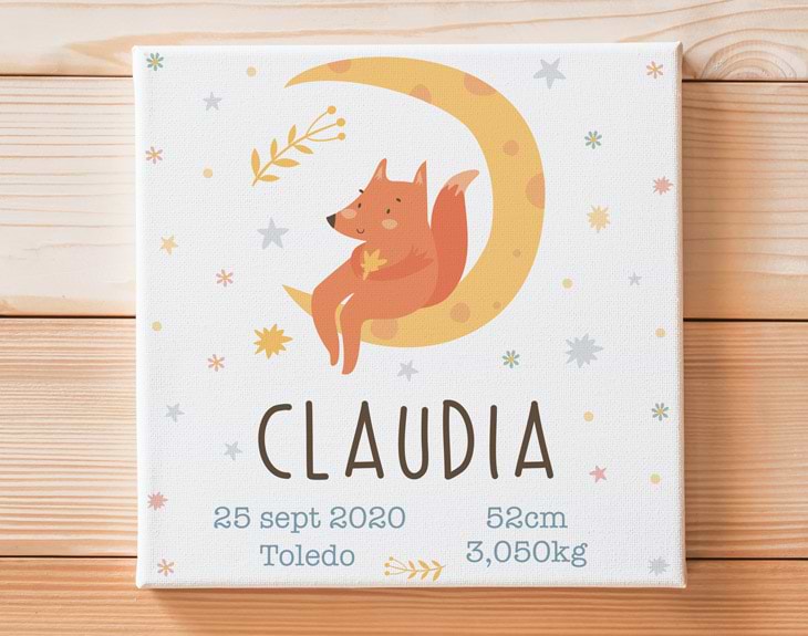 Celebra la llegada al mundo de tu hijo/a con este lienzo personalizado. Cuélgalo en el salón o en su habitación para recordarlo todo sobre aquel mágico día. ¿Dónde fue? ¿Cuánto pesó? Dinos todos los datos de su nacimiento y nosotros los inscribimos en este precioso lienzo. Para una criatura tan mona como la tuya, hemos preparado este diseño infantil para que recuerdes con ternura los primeros momentos del bebé. Por ello, es el perfecto regalo original para esos padres o suegros que ahora son abuelos. ¡El primer regalo de su nieto/a! Personaliza el lienzo con los datos que quieras cuando añadas el producto al carrito. Una vez encargado, te llegará enseguida ya montado listo para colgar y disfrutar. • Los laterales quedan envueltos con el propio lienzo. • Bastidor de 3cm de madera samba. • Tintas con protección para rayos UV. • Se entrega montado, listo para col.