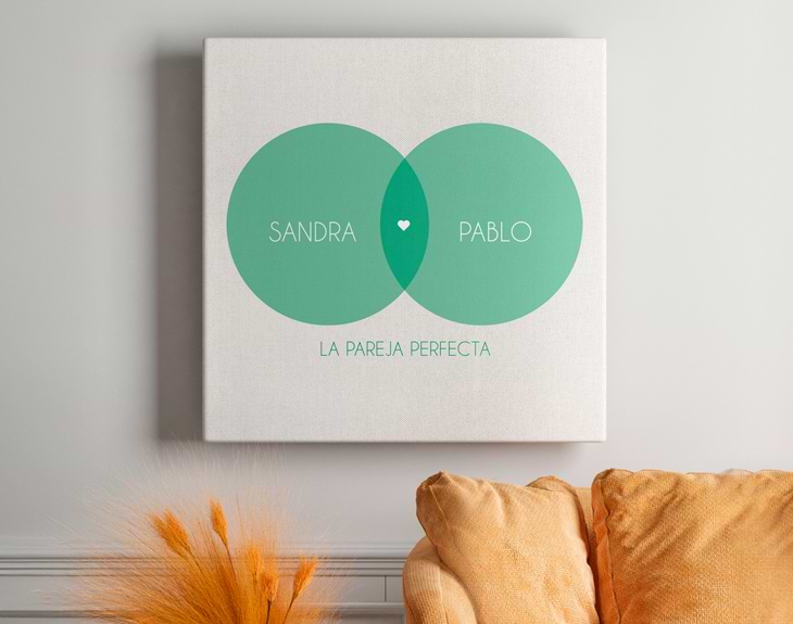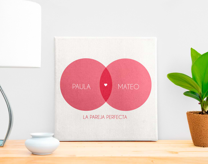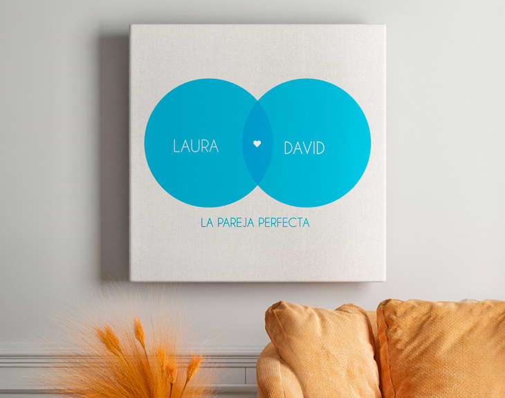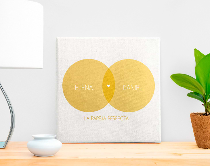 Un precioso lienzo personalizado para la pareja perfecta. Si crees que tu novia y tú hacéis una combinación ideal, este regalo original no se te puede escapar. Con cuatro colores para elegir, es precioso para colgarlo en la habitación. • Los laterales quedan envueltos con el propio lienzo. • Bastidor de 3cm de madera samba. • Impresión a 1440dpi. • Tintas con protección para rayos UV. • Lienzo de algodón de alta calidad ultra blanco de 415 gramos. • Se entrega montado, listo para colgar.