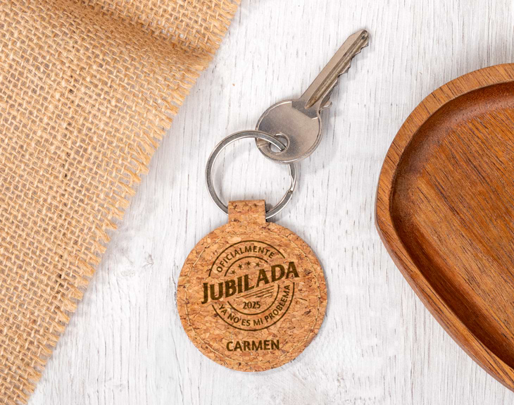 A nadie le gusta perder las llaves de casa o perder tiempo buscándolas dentro del bolso. Si esa persona que se jubila es de las que siempre lleva mil cosas encima y tarda una eternidad en encontrar las llaves, este llavero de corcho es justo lo que necesita. Es práctico, ligero y tiene el tamaño perfecto para llevarlo a cualquier parte. Y lo mejor es que cabe en cualquier sitio. La jubilación es un momento muy especial, una etapa llena de nuevas experiencias, tiempo libre y merecido descanso. Y este llavero personalizado es una forma original y emotiva de celebrar todo lo que esa persona ha dado durante tantos años, porque se ha ganado la llave del descanso, la tranquilidad y las siestas sin fin. Es un regalo de jubilacion perfecto para dar en una fiesta de despedida, como recuerdo de parte de los compañeros o como muestra de cariño por parte de familiares y amigos. Imagina la ilusión que le hará recibir un llavero pensado solo para él o ella. Le encantará. Personalizarlo es muy sencillo, solo tienes que añadir el producto al carrito, accede al área de personalización y escribe el nombre o mensaje que quieras incluir. Nosotros nos encargamos del resto. Porque hoy cierras la puerta del trabajo y abres la de la libertad. Dimensiones: 5cm de diámetro.