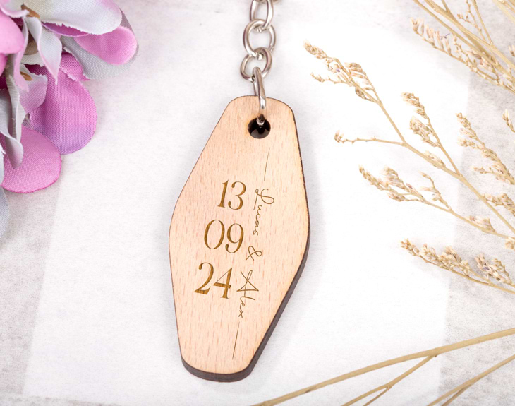 ¡El amor hay que celebrarlo por todo lo alto! Por eso, en una boda es el mejor momento para reunirse con todos los amigos y familiares a festejar el amor entre dos personas. Si el día de tu boda quieres sorprender a todos los invitados, tenemos el detalle perfecto. Se trata de nuestro llavero de madera personalizado con diseño "Fecha de amor". Este llavero es una forma preciosa de agradecer a todos nuestros seres queridos que hayan acudido a esta ceremonia tan especial. ¡Quedará un recuerdo inolvidable! Lo mejor de este llavero de madera es que es personalizable, podrás poner la fecha de la boda junto con los nombre de los novios. ¡Es genial! Personalizar este llavero de madera es súper sencillo. El primer paso a seguir consiste en añadir el producto al carrito y entrar al área de personalización. Una vez ahí, ya puedes la fecha de este día tan especial junto con los nombre los protagonistas. Pronto estará perfecto y listo para regalar. ¡Será un original regalo para bodas!