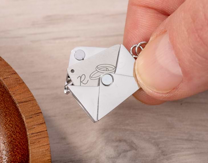 Este llavero personalizado en forma de sobre es el regalo perfecto para celebrar vuestro aniversario de boda. Porque los momentos más especiales merecen ser recordados de una manera única, y con este detalle original llevarás siempre contigo el día en que os unisteis para siempre. Un pequeño recuerdo con el que decir “Sí, quiero” cada día. Con unas clásicas y elegantes alianzas entrelazadas, este llavero con mensaje sorpresa conquistará el corazón de quien lo reciba. En el interior del sobre encontrarás una placa metálica personalizada donde podrás grabar vuestras iniciales o una fecha inolvidable para la pareja. Personalizar este llavero con mensaje sorpresa es muy sencillo: solo tienes que añadirlo al carrito y escribir el texto que quieres que aparezca grabado. En poco tiempo tendrás en tus manos un regalo original, lleno de significado, perfecto para emocionar a esa pareja especial en su aniversario de boda. Medidas aproximadas: 2 cm (ancho) x 1,5 cm (alto). Material: acero inoxidable.