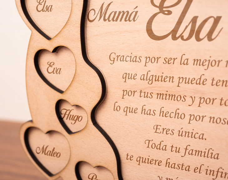 ¿Recuerdas cuando mamá te contaba cuentos antes de dormir? Si siempre ha sido una madre que ha estado día y noche con su familia, esta luna de madera personalizada está pensada para ella. ¡Es un regalo de madera que podrá contemplar todos los días con una sonrisa! Una luna de madera personalizada como esta es el mejor detalle que puedes tener con la mejor mamá del mundo. ¡Le podrás escribir la dedicatoria que quieras! Este producto cuenta con un kit de maderas que juntas forman una preciosa luna repleta de corazones. Estas maderas van en la base, también de madera y que cuenta con una longitud de 14,5 centímetros y un ancho de 6,5 centímetros. ¡Tiene el tamaño perfecto para colocarla en cualquier parte! Un regalo original de madera para mamá con el que la emocionarás sin ningún tipo de duda. ¿Cómo podrás personalizar esta luna tan amorosa? Solo tendrás que añadir el producto al carrito y entrar en el área de personalización. Ahí encontrarás los diferentes tipos de lunas, que varían dependiendo del número de corazones que quieras. Después solo tendrás que escribir en cada uno de los cuadros de texto lo que quieras, ya sea los nombres de toda la familia o una bonita dedicatoria. ¡Nosotros nos ocuparemos de grabarlo en la luna de madera! Medidas de la luna: 19 x 17,5 centímetros. Medidas de la base: 14,5 x 6,5 centímetros.