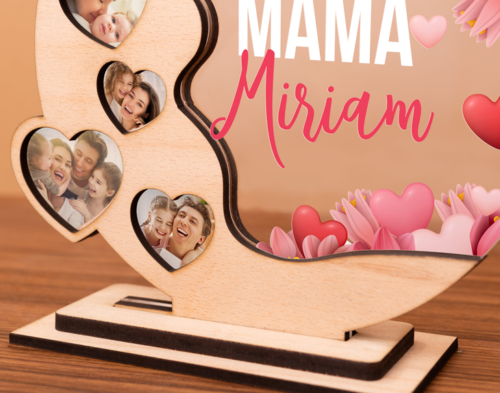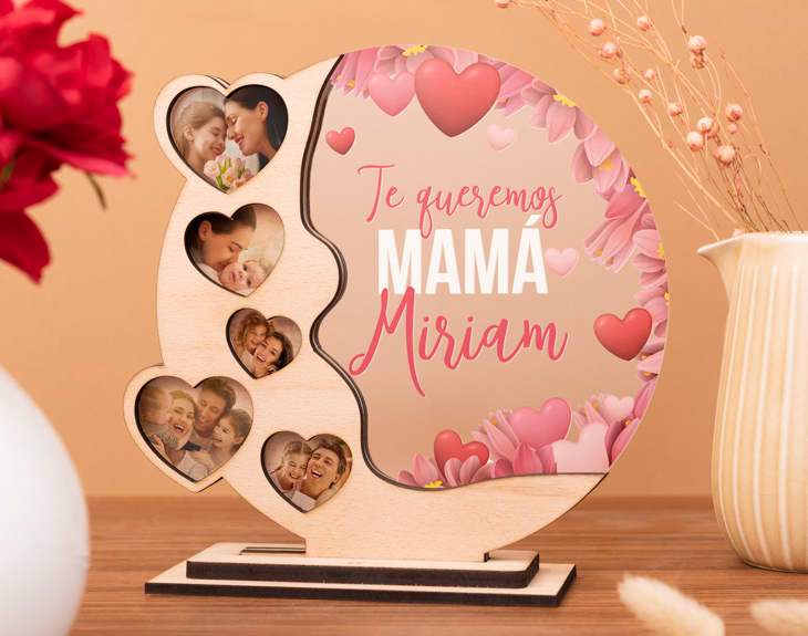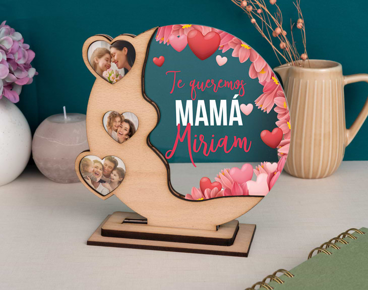 ¿Qué mejor forma de decirle a mamá que la quieres que con un detalle que pueda tener toda la vida? Esta luna de madera y metacrilato personalizada es lo suficientemente resistente para poder estar a su lado para siempre. ¡Una luna que le dirá cuanto la queréis todos los miembros de la familia! Decir "te quiero" de vez en cuando no cuesta nada, y seguro que decirlo a través de esta luna hecha de madera y metacrilato con diseño amoroso dejará a mamá con la boca abierta. Este producto está formado por tres placas, dos de madera y una de metacrilato, que juntas irán en la base hecha de madera. Esta parte cuenta con una longitud de 19 centímetros y una altura de 17,5 centímetros, mientras que la base tiene una longitud de 14,5 centímetros y una anchura de 6,5 centímetros. Un regalo original para madres tiene que quedar increíblemente bien. ¡No es para cualquier persona! ¿Qué mejor forma de hacerlo que con las fotos de algunos de los mejores momentos de su vida? En el área de personalización podrás crear el diseño que quieras, subiendo las fotos al sistema tras clicar sobre el cuadro de foto. ¡Escribe el nombre de la mejor madre del mundo en el cuadro de texto! Medidas de la luna: 19 x 17,5 centímetros. Medidas de la base: 14,5 x 6,5 centímetros.