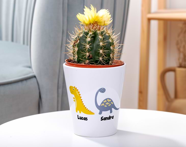 ¿Buscas una actividad relajada para que tus peques aprendan y se desarrollen? ¡Nada mejor que la jardinería para ellos! Les enseña paciencia, responsabilidad y a cuidar de otro ser vivo. Si quieres empezar a inculcarles valores desde pequeñitos, nada como atraerles con un regalo ideal para ellos: la maceta personalizada Familia Dinosaurios. Todos sabemos lo mucho que les gustan los dinosaurios a los niños. Por eso nuestra maceta personalizada Familia Dinosaurios está pensada para enamorarles. Elige los dinosaurios favoritos de tu hijo y completa vuestra propia familia de dinosaurios. Puedes escribir vuestros nombres debajo de cada uno para hacer el regalo aún más único y especial. Si tu peque tiene que plantar una semilla para el colegio o si toda la familia es aficionada a la jardinería, es hora de sorprender a tu niño de la forma más especial: con su propia maceta personalizada. Estamos seguros de que a partir de ahora le pondrá mucho más interés a su plantita y aprenderá a cuidarlas mucho mejor. ¡Será una sorpresa maravillosa! Importante: a partir de 6 personajes, se distribuirán en dos filas. Es decir: - Familia de 6 personajes: 3 en la fila superior, y 3 en la inferior. - Familia de 7 personajes: 4 en la fila superior, y 3 en la inferior. - Familia de 8 personajes: 4 en la fila superior, y 4 en la inferior. Importante: El tipo de cactus puede variar según stock.