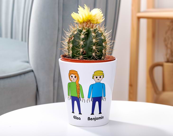 • Maceta personalizada 10x9cm. • Tarjeta recordatoria. Los Playmobil son uno de los juguetes más míticos de la infancia. Es un juguete, además, que no pasa de moda y al que han jugado tanto abuelos, como padres, hijos y nietos. De hecho, hoy en día existe todo un fenómeno fan en torno a estos juguetes y son muchos los que pueden presumir de Playmobil de colección. Si los Playmobil han marcado la vida de esa persona a la que tanto quieres, nuestra maceta personalizada Familia Playmobil será un detalle precioso y perfecto con el que sorprenderles en un día especial. Nuestras macetas están fabricadas en cerámica blanca y tienen un tamaño de 10 x 9 centímetros. Su tamaño las hace perfectas para poder cultivar pequeñas plantas como suculentas o cactus o para poder plantar semillas y ver crecer vuestra plantita desde cero. Gracias a su bonito diseño, son una maceta excelente para cubrir macetas más feas o simples o, directamente, para trasplantar en ella nuestras plantas favoritas. Para añadir más detalle a nuestro regalo, tendremos la opción de comprar nuestra maceta con un cactus natural, que el destinatario podrá cuidar cuando le regales este detalle tan bonito. En cuanto a la personalización, es de lo más sencillo. Al acceder a la herramienta de diseño, contaréis con un catálogo de más 100 personajes con estética Playmobil entre los que elegir. Selecciona en el orden que quieras los personajes que más se parezcan a tu familia o amigos. Añade debajo de cada uno su nombre (optativo) y nosotros nos encargamos de reflejar esa personalización en tu nueva maceta. Sorprender a un amante de las plantas con su propia maceta personalizada es todo un acierto. El regalo funciona genial para completar su sorpresa de cumpleaños o como pequeño detalle en un día especial. Si buscas un regalo de cumpleaños o una sorpresa para el día de la Madre o el día del Padre, no lo dudes, esta preciosa maceta te será de gran ayuda.