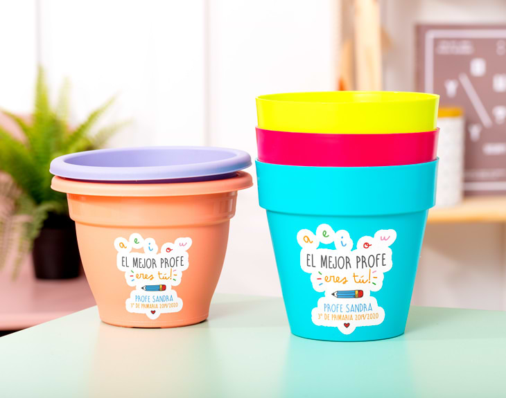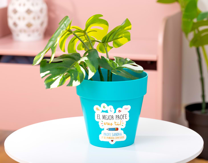 ¿Gracias a tu profe has aprendido un montón de cosas? Si no se ha limitado a enseñaros los apuntes, si no que ha compartido con vosotros consejos que os van a servir para toda la vida, esta maceta personalizada tiene su nombre. Se trata de una bonita manera de agradecerle todo lo que ha hecho por vosotros. Y es que, no todo el mundo tiene la suerte de tener una profe o un profe así de comprometido y guay. Solo tenéis que decirnos su nombre y el texto inferior con el que queréis personalizar la maceta. Podéis incluir el curso, el nombre del cole o una frase especial. ¡Así nunca se olvidará de sus alumnos favoritos! Importante: El tipo de cactus puede variar en función de stock. Colores disponibles y altura: - Verde, azul y fucsia: 12 centímetros. - Gris y naranja: 11 centímetros Material: plástico.