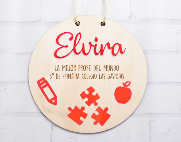 Parece que fue ayer cuando comenzaba uno de los cursos escolares más inciertos de nuestra vida. Septiembre quedó atrás hace muchísimos meses, y el verano cada vez está más cerca. Es el momento de rememorar todo lo que han pasado esos estudiantes en las aulas, las amistades que han formado y todo lo que han aprendido a lo largo de un extenso año escolar. ¿Y quién ha sido el encargado de enseñar a los jóvenes estudiantes todo lo que necesitan saber sobre inglés, matemáticas o lengua? No podían ser otros que los profesores. ¡Hay muchos tipos diferentes de maestros! Sin embargo, el mejor de todos es aquel que siempre ayuda a sus alumnos. ¿El profe de tus hijos hace todo lo que puede para enseñarles todo lo que sabe? Si eso es así... ¡esta madera decorativa para colgar personalizada es ideal para su hogar! ¡Es un producto perfecto para decorar la casa del maestro! Esta madera grabada con metacrilato le servirá para recordar siempre esa magnífica clase que tuvo en un momento clave de su vida. Podrás escoger entre cuatro formas para la madera: círculo (25 cm), cuadrado (20x20 cm), hexágono (17 cm) o banderín (24x16 cm). Tras esto, solo tendrás que escoger el color del metacrilato y los textos que vayas a incluir en el diseño. ¡Le dejaréis con la boca abierta con este regalo original para profesores! Medidas: - Círculo: 25 cm de diámetro. - Cuadrado: 20x20 cm. - Hexágono: 25x21,6 cm. - Banderín: 25x17 cm.