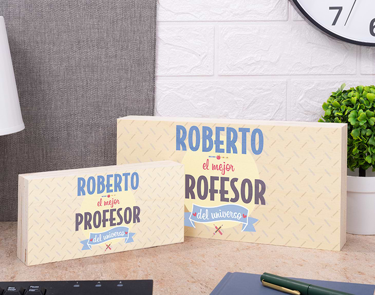 ¿Quieres darles una sorpresa a tu profe por el final de curso? Esta madera personalizada es el regalo perfecto para el mejor profe del universo. Solamente nos tendrás que decir su nombre y lo grabaremos en estas maderas tan originales. Es una bonita forma de agradecerle a tu profe lo mucho que has aprendido en sus clases y lo mucho que valoras su trabajo. Seguro que cuando se lo des tendrá una sonrisa de oreja a oreja y lo guardará con mucho cariño para siempre. Importante: Las maderas tienen vetas y estas quedan reflejadas en la imagen. Tenemos dos tamaños disponibles: - 20 x 10 cm. - 30 x 15 cm