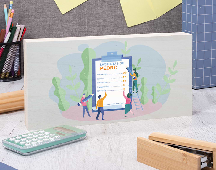 ¿Este año vuestro o vuestra profe se ha portado bien con las notas? Ahora sois vosotros quiénes le vais a evaluar. Que mejor regalo para el final de curso que esta madera personalizada Las notas del profe. Seguro que le hará mucha ilusión y las risas están garantizadas. Solo nos tendréis que decir que notas le pondríais en asignaturas tan importantes como la paciencia, sabiduría o diversión. ¡Seguro que aprueba y con buena nota! ¿No os parece un regalo súper original? Importante: Las maderas tienen vetas y estas quedan reflejadas en la imagen. Tenemos dos tamaños disponibles: - 20 x 10 x 4,2 cm. - 30 x 15 x 4,2 cm