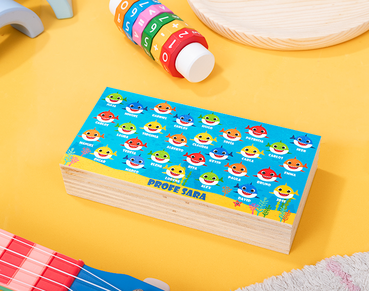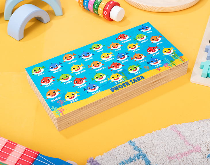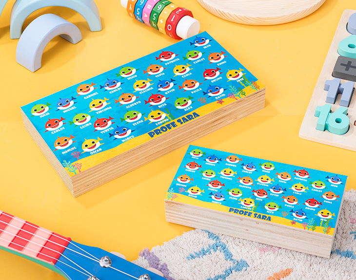¿No podéis parar de cantar la canción de Baby Shark en clase? Si desde que vuestra profe preferida la puso os pasáis el día tarareándola, esta madera personalizada es el regalo perfecto para darle una gran sorpresa. Se trata de un divertido diseño que representa a una auténtica clase Shark. Podéis personalizarla con vuestros nombres y un texto inferior, como por ejemplo, el nombre de la profe, del colegio o de la clase...¿No os parece una idea fantástica? Seguro que lo guarda en su rincón preferido del aula para recordar siempre a sus alumnos favoritos. Importante: Las maderas tienen vetas y estas quedan reflejadas en la imagen. Tenemos dos tamaños disponibles: - 20 x 10 x 4,2 cm. - 30 x 15 x 4,2 cm