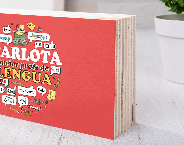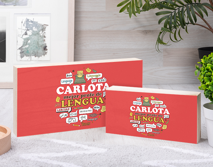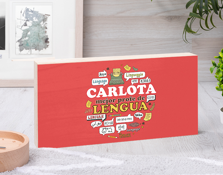 • Tabla abedul personalizada. • Tarjeta Recordatoria. Desde que empezamos el colegio, la lengua forma parte esencial de nuestros estudios. Desde que empezamos a leer hasta que estudiamos los diferentes movimientos literarios pasan un montón de años y, también, un montón de profesores que se esfuerzan por ayudarnos a entender mejor su asignatura. Si cuando piensas en el mejor profe de Lengua que has tenido, te viene un nombre claro a la memoria, ese profe está claro que se ha ganado un regalo tan único y especial como nuestra madera personalizada mejor profe de Lengua. Estas tablas están fabricadas en madera de abedul y, como hemos comentado anteriormente, cuentan con un grosor de unos 3-4 centímetros para que puedan sostenerse en un lateral y ser expuestas. En el momento de hacer tu compra, puedes escoger entre dos tamaños de regalo diferentes: de 20x10 cm y de 30x15 cm. Durante la fabricación del regalo, procuramos conservar las vetas naturales de la madera, ya que creemos que le dan un toque artesanal y son parte del encanto de este material. La impresión se realiza directamente sobre la madera y no se aplica tratamiento sobre el producto, es decir, el resultado es totalmente mate. No obstante, si prefieres un acabado brillante, no habría problema en barnizarlo una vez lo recibas. La personalización consiste en dar importancia al nombre de tu profe favorito, unido a la frase “mejor profe de lengua”. Alrededor hemos puesto un montón de símbolos asociados a la asignatura y que rodean los textos en forma circular. Toda la impresión se realiza sobre un fondo rojo que completa el regalo. No existe mejor detalle para sorprenderlo o sorprenderla en este fin de curso.