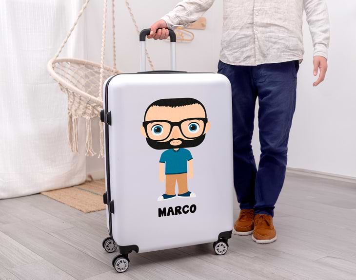 ¿A quién no le gusta viajar? Decidir el destino, conocer nuevas culturas y disfrutar de la gente que vas descubriendo por el camino es lo más. Por eso, cualquier viaje que hayas planeado se merece que lleves una maleta grande personalizada tan chula como esta. Podrás guardar todo lo que necesites, viajes en vernao o en invierno. ¡Es lo más! Sin duda, lo mejor de esta original maleta es que puede ser el regalo perfecto para esa persona que ama viajar y lo hace muy a menudo. Y además, nadie tendrá una maleta como esta, porque podrás añadir su propio muñeco personalizado. ¡Así es imposible que se pierda! Para personalizarla, el primero paso es añadirla al carrito. Despues, cuando entres en el diseñador, vas a poder crear tu personaje desde cero añadiendo todos los detalles que creas que son necesarios. Termina añadiendo un nombre y listo. ¡Quedará perfecto y listo para la próxima aventura! Medidas: - Maleta grande: 74 cm x 47 cm x 29 cm. El interior está compuesto por dos compartimentos con cremallera, donde podrás organizar toda la ropa y los complementos para no perder nada. Además, también cuentan con un bolsillo en el que guardar cualquier tipo objeto. Importante: la maleta cuenta con un sistema de seguridad con candado TSA. Las cremalleras de la maleta se pueden introducir en dos espacios, protegidos por este código. Si no introduces el código correcto, las cremalleras no podrán salir y no se podrá abrir la maleta.